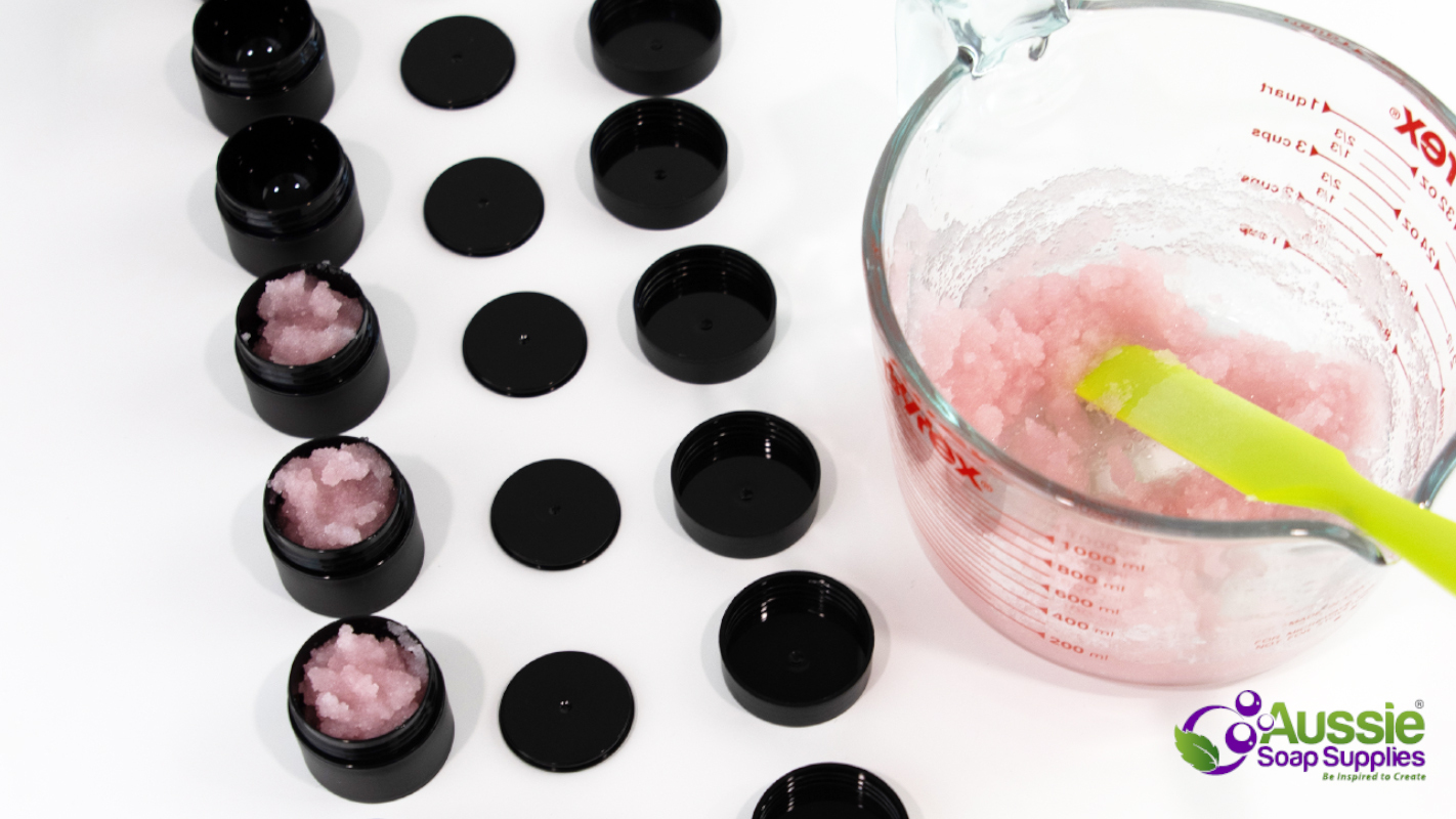 Spoon the finished scrub into 9 × 15ml lip scrub jars, gently tapping to remove air pockets, and seal. Be careful not to overfill if using the casker seal.